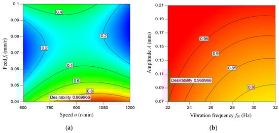 Contour lines of surface roughness satisfaction function. (a) The effect of speed and feed, (b) The effect of amplitude and vibration frequency.