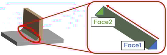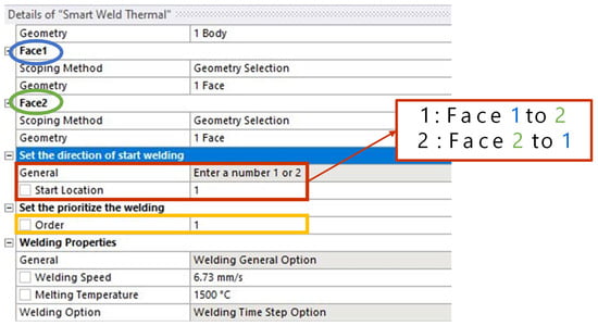 This study implemented a simplified method to input welding temperature directly instead of specifying variables related to heat input, such as arc voltage and current. The welding temperature is typically set to exceed the material’s melting point. Additionally, as shown in Figure 1 and Figure 2, for the convenience of welding analysis, the welding direction and order can be easily configured. After modelling the welding bead and creating the mesh, users can select the starting and finishing face of the welding bead, and welding proceeds from the starting face to the finishing face. In other words, if the bead shape is provided, the weld path can be easily defined. Simultaneous welding analysis is also possible if multiple beads are assigned the same order priority.