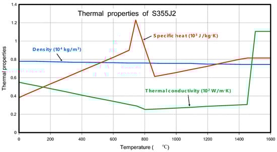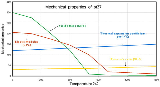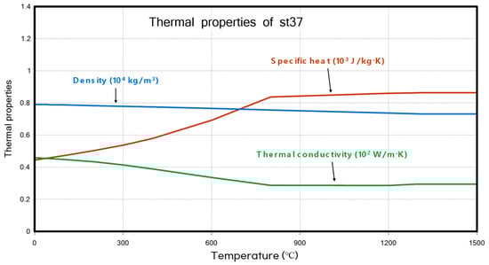 The material properties used in this study were the same as those in the previous research [], St37. The detailed thermal and material properties are shown in Figure 11 and Figure 12, respectively.
