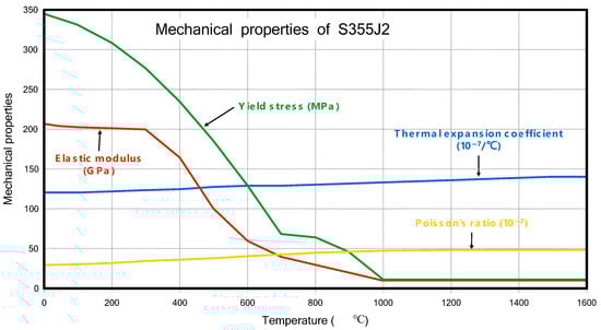 The material properties used in this study were also the same as those in the previous research [], specifically the properties of S355J2. The thermal and mechanical properties are shown in Figure 4 and Figure 5, as shown below.