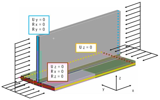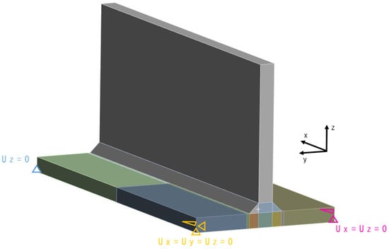 The mesh of the analysis model is shown in Figure 6. A 3D solid, linear element was used, and to reduce the analysis time, the number of elements (NoE) is two in the thickness direction. The differently coloured parts in the figures represent distinct sub-parts. The boundary conditions from Perić et al. [] were applied. The applied boundary conditions are shown in Figure 7. Boundary conditions were imposed at the middle plane in the thickness direction of the main plate. For the reference point, was applied; for the second point, ; for the third point, ; and for the remaining point, a free condition was applied.