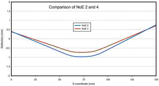The number of elements (NoE) in the thickness direction must be an even number to apply boundary conditions to the central node in the thickness direction. Therefore, we performed the analysis with NoE set to 2 and 4 in the thickness direction and compared the z-deflection and computation time. As shown in Figure 8, there was no significant difference in z-deflection between NoE 2 and 4, while the computation time increased by a factor of 5. Furthermore, analysis time is also a critical factor for the parametric study aimed at obtaining thousands to tens of thousands of welding analysis data in the future. Hence, in this study, we conducted the analysis with NoE set to 2 in the thickness direction.