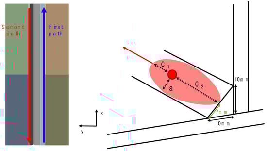 First, the welding temperature was set to 1500 °C, which is the melting point of the material. The other welding conditions were wet according to the welding conditions in Perić et al. []. The welding speed was set to 404 mm/min (6.73 mm/s), the convection coefficient was set to 10 W/°C, and the emissivity was set to 0.9. The welding direction is shown in Figure 8, where the welding directions of the first and second beads are different. Additionally, there is an intercooling period between the first and second bead welds, and the second bead welding begins after the temperature of the first bead drops to 200 °C. The simulation of the heat source was modelled using Goldak’s double ellipsoidal model. In the welding experiment and analysis by Perić et al. [], the bead leg length was 10 mm. Geometrically, as shown in Figure 9, the half-width (a) of the bead surface is approximately 7 mm, with the fore length (C1) set to 7 mm, which is the half-width of the bead surface, and the rear length (C2) set to 28 mm, which is twice the bead surface width.