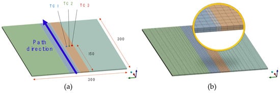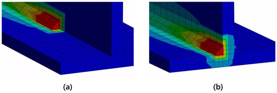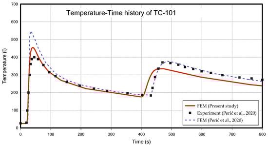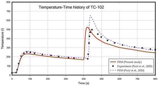Figure 13 and Figure 14 show the temperature changes over time measured at the TC-101 and TC-102, respectively, comparing the results of this study with the result from Perić et al. []. Although the peak values showed a maximum difference of about 11% in TC-101, the overall temperature profile was very similar between the two studies, and the temperature profile of TC-102 is more similar to the experiment data of Perić et al. [] than FEM result of Perić et al. []. The two results showed a slight difference in the timing of the second bead welding. In previous research [], the intercooling was applied based on time (352 s), whereas in this study, it was applied based on a temperature condition (200 °C). In this study, the intercooling temperature was adjusted appropriately to align the second bead welding start time as closely as possible with the study by Perić et al. []. Figure 15a,b show the configurations (31 s, 431 s) during the thermal analysis, respectively.