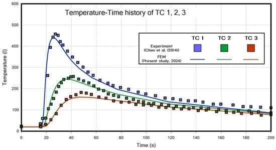 Groove welding is a predominant form of welding employed in industry, wherein two components are joined by welding their mating surfaces. Based on the degree of penetration achieved at the joint, groove welding is categorised into complete (full penetration) welding and incomplete (partial penetration) welding, with specific industry guidelines applicable to each category. In the present study, we have conducted a welding analysis focusing on the most representative butt weld. To verify the accuracy of the current welding model, we conducted a comparison with the previous study []. The same model and mesh as those used in the reference study (see Figure 10) were adopted, with the material properties of St37 (low carbon steel) applied. To demonstrate good agreement with the experimental temperature data reported in their paper, we compared the experimental and FEM temperature data at three points located 10 mm, 20 mm, and 30 mm away from the bead centre, TC-1, 2, and 3, respectively.