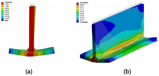 This study conducted a compression analysis after the T-joint fillet welding analysis for demonstration. For comparison, a traditional analysis method was performed as a comparative analysis. In this case, for initial deformation, the buckling shape mode from eigenmode analysis was applied, and the applied initial deflection is average-level, as shown in Equation (1) defined by Smith et al. [], with plate slenderness ratio () of 0.4084. The results of the eigenmode analysis are shown in Figure 22a. For the residual stress, an idealised residual stress formula for plates was used to input the values. The residual stress method follows the previous research approach [], specifically applying the average level values. The results from the applied methods are shown in Figure 22b.