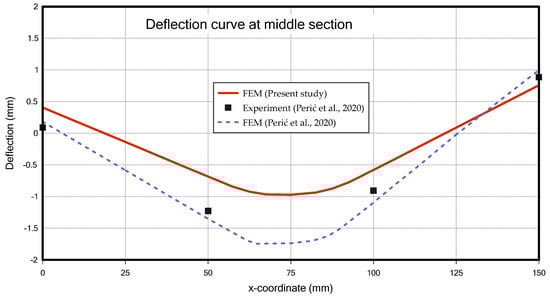 Figure 18 compares the results of this study with those of Perić et al. [], showing the z-deflection in the middle section. In comparison with the experimental data, the result from this study showed a slightly larger error than the FEM results of Perić et al. []. This discrepancy is likely due to the fact that the welding temperature was set to the material’s melting point in this study, which is lower than the actual welding temperature, thereby reducing the overall heat input.