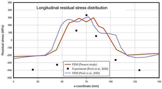 The residual stress in this study shows a more symmetrical distribution compared to the results of Perić et al. []. However, the maximum residual stress is slightly lower than experimental data from previous research [], which can be attributed to the fact that the welding temperature was set to the melting point of the material, which is lower than the actual welding temperature, resulting in lower overall heat input.