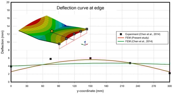 Figure 16 shows the temperature measurement points and the comparative results of the temperature data at these locations. Although there are discrepancies in the peak values of the analysis results, the overall trends exhibit good agreement. To validate the structural analysis, the experimental data from the referenced paper [] were compared with the FEM analysis results obtained in this study.