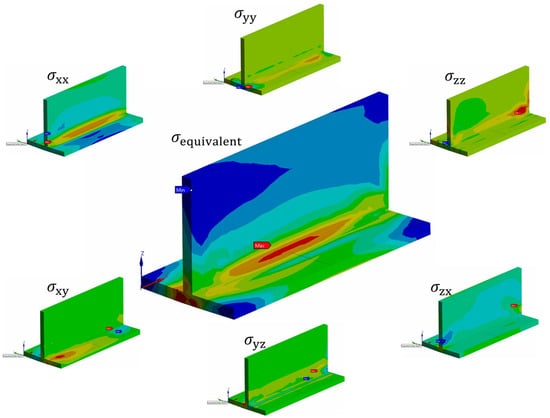 As mentioned earlier, the main results of the welding analysis in this study are the residual stress and deformation caused by welding. The six stress components () at each node can be extracted to assess the residual stress of the member (Figure 21). Various subsequent studies, such as compression and fatigue analysis, can be conducted using the deformed shape and residual stress from the welding analysis as the initial deflection.