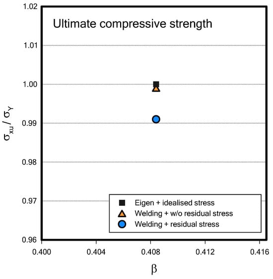 Due to the low plate slenderness ratio (), there was no significant difference among the three cases, as shown in Figure 24. Despite the lowness of plate slenderness ratio (), conventional analysis (eigen + idealised residual stress) assesses the strength most highly, followed by the analysis case of only considering welding-induced deformation. When considering both welding-induced deformation and residual stress, the ultimate compressive strength of the component is the lowest among the three cases (about 1% less than eigen + idealised residual stress). However, the present study only considered a limited number of the scenarios. Therefore, additional studies, i.e., ULS comparison, effect of residual stress, and modelling technique, are recommended to be conducted in the future as widely investigated by Li et al. [] using 2D shell element.