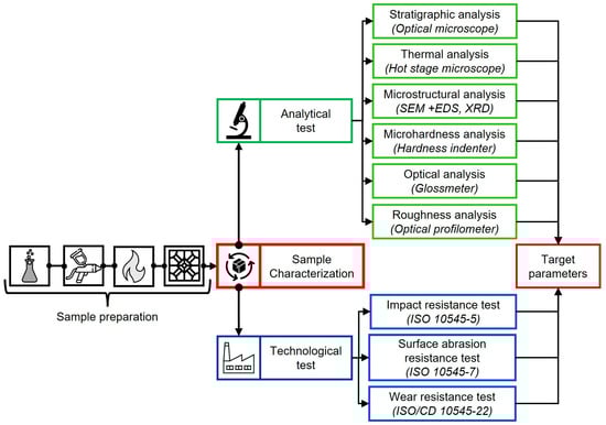 The glaze characterization protocol (Figure 1) has been developed primarily by considering properties that shall be determined on the glaze layer, which is jointly fired with the ceramic tile body. The first steps of the protocol address sample preparation, closely replicating the industrial manufacturing process, which involves the airless application of engobe and glaze coatings to the ceramic tile body, followed by drying and firing steps.