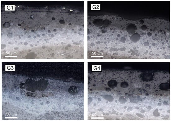 The designed GCP was validated by testing G1, G2, G3, and G4 glazes. Optical observations were carried out on polished cross-sections of the four investigated glazes to measure the thicknesses of both the engobe and glaze layers. The analyzed cross-sections are reported in Figure 2. The airless application of engobe and glaze layers on the body surface results in an uneven coating, leading to notable variations in the thickness of each layer after the firing process. The outcome of the image analyses highlights that engobe thickness is in the range between 40 and 70 µm, while glaze thickness ranges from 30 to 60 µm. Comparing all the samples, no significant variations were observed between the glazes, due to the fact that the same amount (44 mg/cm2) of engobe and glaze slurries was deposited on the green body surface. Micrographs for G1 reveal a small number of closed pores with diameters ranging from 10 to 20 µm. Conversely, a high number of closed pores are observed in G2, G3, and G4, exhibiting larger diameters in the range between 30 and 50 µm. Additionally, a large number of small closed porosities ranging from 5 to 30 µm are also observed in the engobe layer. Closed pores can be primarily attributed to the gas entrapment caused by substrate degasification during firing [46,47]. The entrapment of gas bubbles within the glaze layer also depends on its viscosity and fusibility in correspondence to the peak temperature of the industrial firing cycle (TP = 1205 °C) [48].