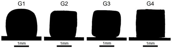 In correspondence to TP = 1205 °C, G1 falls within the range defined by sphere (TSP = 1203 °C) and hemisphere temperatures (THSP = 1220 °C) (TSP < TP < THSP). The shape of the G1 glaze pellet suggests that at TP, G1 is losing its structural stiffness, indicating a reduction in its viscosity. Conversely, G2 and G3 result in the softening stage (TSO < TP < TSP), with TSO = 1180 °C and TSP = 1232 °C for G2 and TSO = 1170 °C and TSP = 1210 °C for G3. These two glazes exhibit a rounding of the corners due to the coexistence of liquid and solid states. Finally, G4 results in the sintering phase (TSI < TP < TSO) with TSI = 1197 °C and TSO = 1240 °C. At TP, G4 exhibits shrinkage without any change in shape, suggesting the highest viscosity among the four samples.