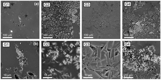 Low- (a) and high-magnification (b) SEM observations of the surface of G1, G2, G3, and G4 acquired backscattered electrons.