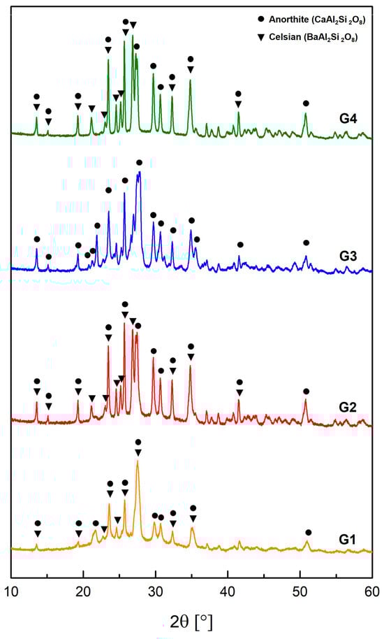 The results of SEM investigations have been also compared with micrographs and crystalline habits reported in the literature [11,14,16,17,19,21,27,52,53,54]. This comparative analysis highlights that the square-shaped crystals containing Ba, observed in G1, G2, and G4, may correspond to celsian (BaAl2Si2O8) [16,27,52,53,54]. Conversely, the bar-shaped crystals, clearly visible in all the samples (and especially in G3), may correspond to anorthite (CaAl2Si2O8) [5,11,14,19]. To further support these associations, XRD analysis was performed on G1, G2, G3, and G4 samples, and the results are presented in Figure 7.