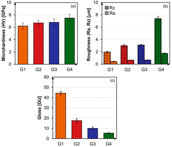 Results of: (a) HV test, (b) Rz and Ra roughness analysis, and (c) gloss measurements carried out on G1, G2, G3, and G4.