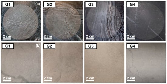 Surface abrasion damages on (a) dark blue decorated samples (G1 to G4) after 600 abrasion cycles and (b) light gray decorated samples (G1 to G4) after 1200 abrasion cycles. The test was carried out according to ISO 10545-7.