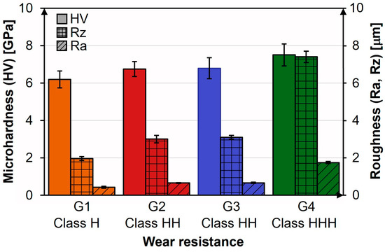 Correlation between Vickers microhardness (HV), average roughness and maximum height of the roughness profile (Ra and Rz) parameters, and wear resistance class.