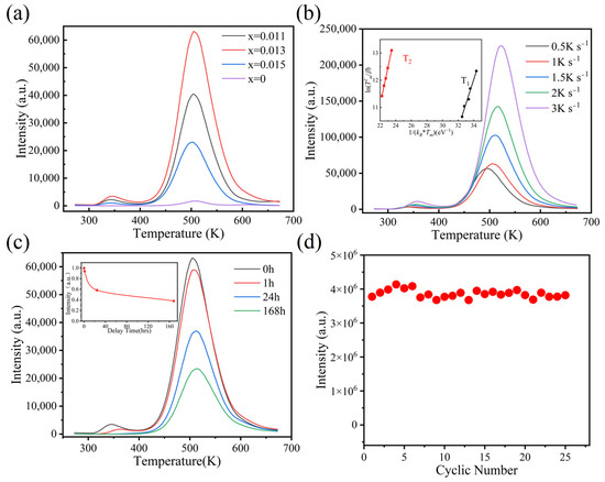 Trap levels are closely related to the information storage properties of ETMs; they are generally analyzed by the thermoluminescence (TL) curve. TL involves the process in which storage optical energy by irradiation with light is re-emitted by heating. As an effective tool to study the trap levels, the TL curve provide lots of information about the traps. The peak position is related to the trap depth, and the peak intensity is related to the number of traps. Therefore, the TL curves of the LuAG:xCe3+ materials were measured at 1 K s−1 in Figure 2a. There are two different depths of trap (T1 and T2). Compared with the pure LuAG, the TL intensity of LuAG:0.013Ce3+ is significantly improved. The calculation of the depth is as shown in Figure 2b. The specific calculation method is shown in the following formula [35,36]: