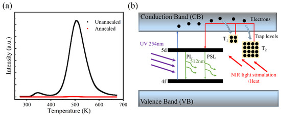 (a) TL curves of LuAG:Ce before and after annealing at 1000 °C. (b) A diagram of the information storage principle.