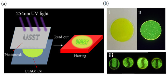 An experimental scheme of the optical storage and readout is shown in Figure 4a. The 254 nm UV light is irradiated to the sample through the mask. The electrons in the material are excited and transitioned to the CB, and then captured by the deep trap level and stabilized for a period of time, that is, the letters “USST” are recorded into the storage medium, and the data are read by heating the sample. Figure 4b was photographed in sunlight (i) and 254 nm light (ii). As shown in Figure 4b(iii), LuAG:Ce was covered with a mask, then irradiated with a 254 nm UV lamp for 5 min, and heated to 250 °C; the letters “U, S, S, and T” were read out, and the unirradiated area was black.