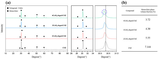 The phase analysis results after applying thermal stress to 2–4 mol% CeO2-doped CSZ are shown in Figure 4. The monoclinic phase fraction (Vm) of zirconia was significantly increased from 7.14% to 23.26% in the case of 9CSZ, whereas under the 2–4 mol% CeO2 doping conditions, it was relatively less changed to 10.91%, 10.03%, and 9.15%, respectively. These results indicate that the phase stability of 9CSZ with CeO2 improved under thermal stress. The reduction in oxygen vacancies and the minimization of lattice structure distortion are believed to be caused by the substitution of Ce4+, which has the same electric valence state as Zr4+ and a similar ionic size.