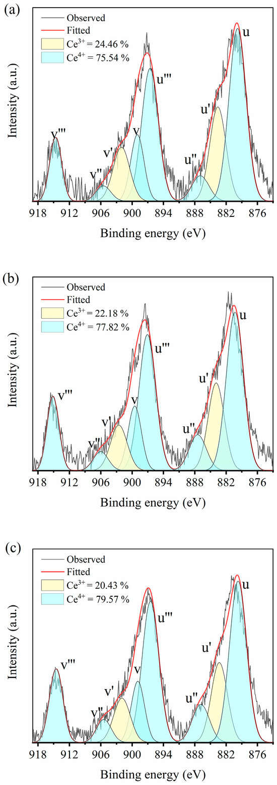 Ce 3d XPS spectrum and deconvoluted cures for Ce3+ and Ce4+ after background subtraction of (a) 2Ce_CSZ, (b) 3Ce_CSZ, and (c) 4Ce_CSZ.