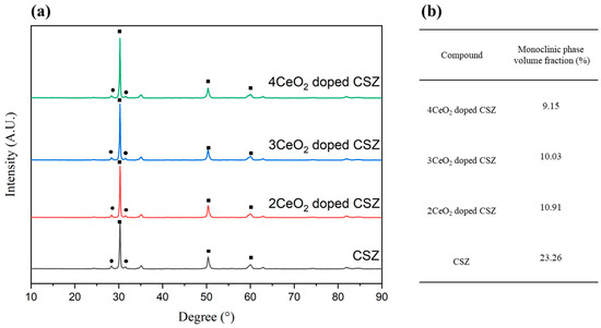 (a) XRD diffraction patterns of CeO2-doped 9CSZ after thermal shock (△400 °C) (•: monoclinic phase, ◼: tetragonal or cubic phase), (b) Phase fraction determined through Rietveld refinement.