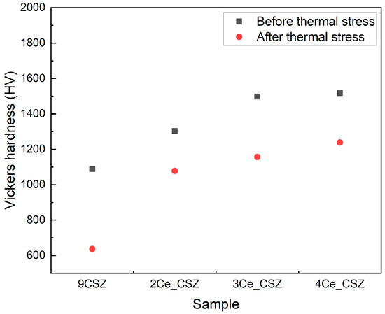 Vickers hardness of CeO2-doped CSZ before (black scattered point) and after (red scattered point) post-heat treatment.