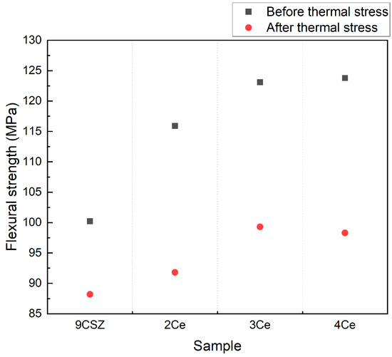 The flexural strength before and after thermal shock is shown in Figure 6. The flexural strength gradually increased with an increase in CeO2 doping content, and the flexural strength of all specimens decreased after thermal shock. Specifically, the flexural strength of 9 mol% CSZ before the thermal shock test was 100.23 MPa, while the flexural strength of 2–4 mol% CeO2-doped CSZ was 115.9 MPa, 123.1 MPa, and 123.8 MPa, respectively. After thermal shock, the flexural strength of 9 mol% CSZ was 88.2 MPa, and the flexural strength of 2–4 mol% CeO2-doped CSZ was 91.38 MPa, 99.3 MPa, and 98.3 MPa, respectively. The decrease in flexural strength of CeO2-doped CSZ after the thermal shock was greater compared to 9 mol% CSZ, but it still exhibited higher values than 9 mol% CSZ even after the thermal shock. The increase in flexural strength for 4 mol% CeO2-doped CSZ was smaller compared to 3 mol%-doped CSZ, which was consistent with the trends observed in the Vickers hardness results.