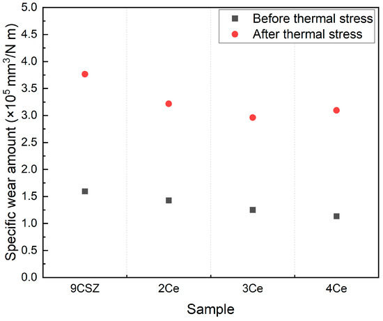 Specific wear amount of CeO2-doped CSZ before (black scattered point) and after (red scattered point) post-heat treatment.