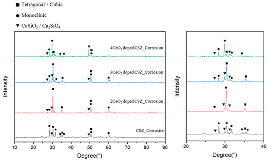 Figure 8 shows the phase transition of the CeO2-doped CSZ after an erosion test with a highly basic CaF2-based slag to examine the effect of CeO2 doping on the erosion resistance of CSZ. The monoclinic phase fraction of 9CSZ increased significantly from 7.144% to 67.71% after the erosion test, while 2Ce_CSZ and 3 Ce_CSZ showed a relatively lower monoclinic phase fraction of 4.07% and 30.85%. The 4Ce_CSZ showed a higher monoclinic phase faction of 77.12%. As the CeO2 content increased, the monoclinic phase fraction also tended to increase, with the 2 mol% CeO2 doping condition showing the lowest monoclinic phase fraction.
