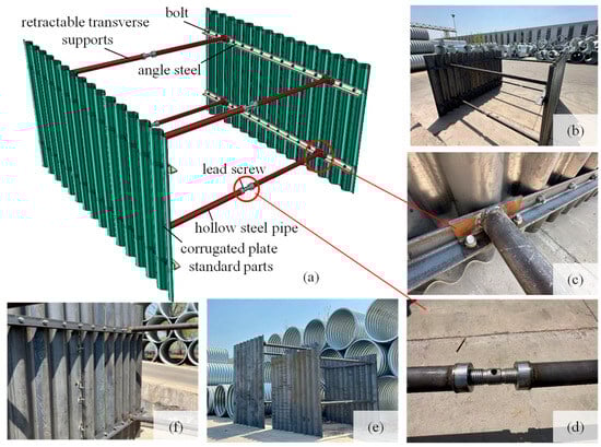 Addressing characteristics of narrow strip type, shallow depth, and high timeliness requirement for the trench of the thermal pipeline, a recyclable support structure without embedment depth was proposed, as shown in Figure 2. The support structure comprises corrugated plate structural standard parts, retractable transverse supports (i.e., horizontal braces), angle steel, and high-strength bolts. Compared to flat plates, corrugated steel standard parts offer large out-of-plane stiffness and high buckling strength [20]. The corrugated plate standard parts are connected by angle steel after overlapping along the trench axis. A lead screw is installed in the center of the retractable strut, allowing adjustment of the spacing of corrugated steel on both sides. Angle steel and corrugated plates, as well as angle steel and transverse supports, are connected using high-strength bolts.