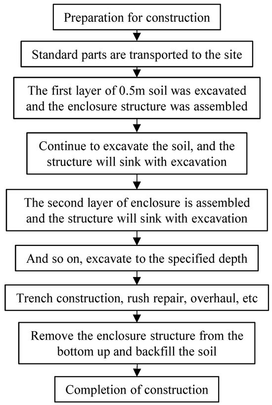 With the rapid pace of urbanization, the demand for the construction, maintenance, and renovation of underground pipelines in urban sensitive areas has grown dramatically [1]. For instance, over 100,000 km of underground pipelines are expected to be renovated annually in China in the coming years. Trenching is required for the installation, emergency repairs, and upgrades of pipelines. Given the small excavation volumes and short construction durations of pipeline foundation pits, excavation is often carried out by sloping or using simple support structures [2]. However, this approach increases the risk of trenches (or foundation pits)overturning and collapse accidents [3,4]. Traditional excavation shoring systems, such as steel sheet piles, soil-nailing walls, and timber supports, have been commonly used for supporting trench walls and preventing collapse. These systems, while effective in certain cases, often face limitations in terms of cost, adaptability, and environmental impact. Developing a new support system tailored to the unique requirements of underground pipeline projects is a pressing challenge in the field of municipal engineering.