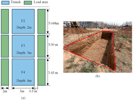 Three trenches (designated F2, F3, F4) were constructed for the prototype test. Each trench has a width of 3 m. The depths and lengths of the trenches are as follows: trench F2 has a depth of 2 m and a length of 3.048 m, trench F3 has a depth of 3 m and a length of 3 m, and trench F4 has a depth of 4 m and a length of 3.45 m, as shown in Figure 4. The loading areas are located on both the left and right sides of each trench, positioned 0.5 m from the trench edges. Each loading area measures 2 m in length and 3 m in width, covering an area of approximately 6 m². The design parameters of the supporting structure are listed in Table 1.