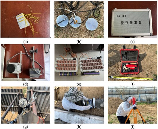 Test equipment and its testing site; (a) strain gauge; (b) earth pressure box; (c) frequency meter; (d) cable displacement sensor; (e) static stress and strain testing and analysis system; (f) total station; (g) strain gauge installment; (h) earth pressure measurement; (i) soil settlement measure.