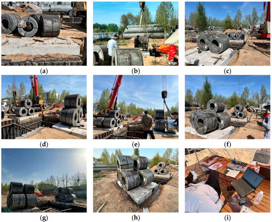 Prototype test phenomenon; (a) loading base; (b) first steel coil; (c) second steel coil; (d) third steel coil; (e) fourth steel coil; (f) fifth steel coil; (g) sixth steel coil; (h) rain simulation; (i) monitoring site.