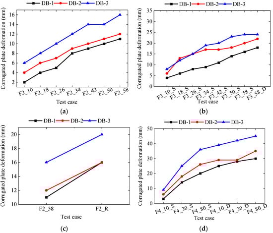 Relative deformation of a corrugated plate; (a) F2 case; (b) F3 case; (c) F2_R case; (d) F4 case.