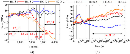 The stress–time history curve of the structure in the prototype test is shown in Figure 10, using transverse support stress as an example. The maximum stresses of the corrugated plates and transverse support at each test stage are illustrated in Figure 11 and Table 4.