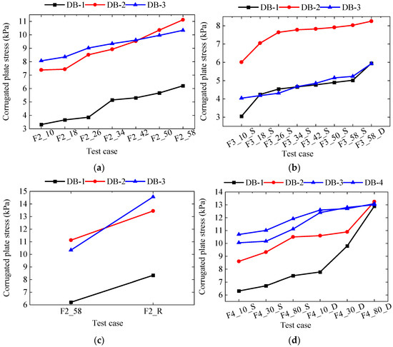 Stress of corrugated plate; (a) F2 case; (b) F3 case; (c) F2_R case; (d) F4 case.