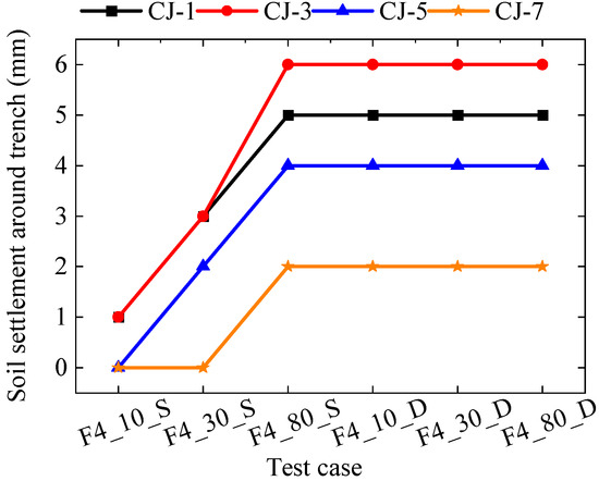 The deformation of the soil surrounding the trench and at the trench bottom in the prototype test of the new support structure is illustrated in Figure 12 and Table 5, taking a trench with a depth of 4 m as an example (i.e., Case F4). During the test, as the weight of the unilateral load on the trench increased, the settlement of the external soil gradually increased. Upon completion of the unilateral loading, the maximum settlements at measurement points CJ-1, CJ-5, and CJ-7 were 5 mm, 6 mm, and 4 mm, respectively. Bilateral loading had minimal impact on surface settlement. Following the completion of the test loading, the maximum uplift deformation of the trench bottom soil was 4 mm.