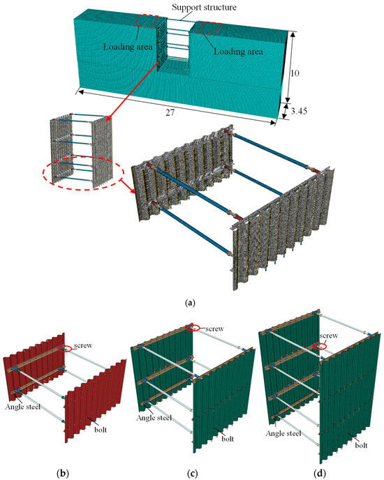 In the model, the support structure is constructed from Q345 steel and employs an elastic constitutive model. It is assumed that the material enters a plastic state once the applied stress exceeds its yield strength. The surrounding soil is modeled using the Mohr–Coulomb constitutive model, with soil parameters matching those of the in situ test layer. The model is constrained to prevent normal displacement around its perimeter, featuring fixed boundary conditions at the bottom and a free surface at the top. To address the issue of convergence between different mesh sizes, it is assumed that the angle steel is rigidly connected to the corrugated plate, utilizing the Tie algorithm for modeling. The bolts connecting the horizontal support and angle steel to the corrugated plate, as well as the soil-corrugated plate interaction, are modeled using surface-to-surface contact interactions. Since there are no specific parameters defined in current experimental standards and engineering codes for heat conduction trenches, a load equivalent to twice the vehicle load (i.e., 40 kPa) is applied to both sides of the trench, referring to Chinese Code for Design of Building Foundation (GB 50007-2011) [21]. The numerical simulation model is depicted in Figure 13a, which includes trench depths of 2 m, 3 m, and 4.5 m, as illustrated in Figure 13b–d.