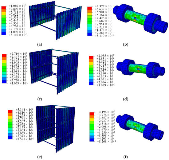 Structural stress nephogram; (a) structural stress in 2 m deep trench; (b) screw stress in 2 m deep trench; (c) structural stress in 3 m deep trench; (d) screw stress in 3 m deep trench; (e) structural stress in 4.5 m deep trench; (f) screw stress in 4.5 m deep trench.