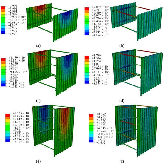 Structure displacement cloud map; (a) horizontal deformation in 2 m deep trench; (b) vertical deformation in 2 m deep trench; (c) horizontal deformation in 3 m deep trench; (d) vertical deformation in 3 m deep trench; (e) horizontal deformation in 4.5 m deep trench; (f) vertical deformation in 4.5 m deep trench.