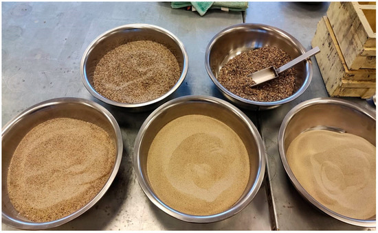 In order to assess the effect of mineral additives on the alkaline reactivity of the aggregate, river sand with a grain size of 0/2 mm was used. Since the natural grain size of the sand did not meet the requirements specified in [39], it was fractionated into individual fractions (Figure 1) and then mixed in accordance with the grain size requirements presented in Table 1.