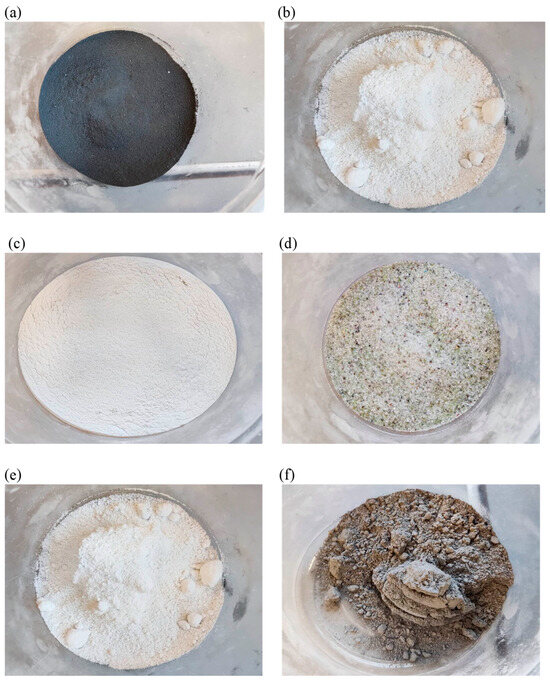 Mineral additives: (a) compacted microsilica, (b) white microsilica, (c) glass powder, (d) glass granulate, (e) limestone powder, and (f) basalt dust.