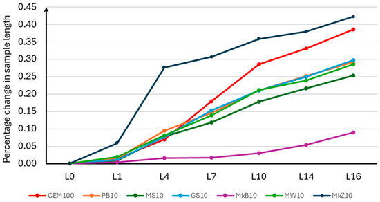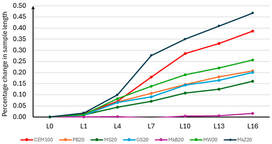 As in the case of Stage 1, for samples with 20% mineral additives, the difference between the zero measurements of the sample length and the measurements of the length at each storage period was calculated to the nearest 0.001% of the effective distance between the ends of the plugs placed in the mortar, according to Equation (1). The results of the percentage change in the length of the samples for Stage 2 are presented in Table 8, and the average values are shown in Figure 5.