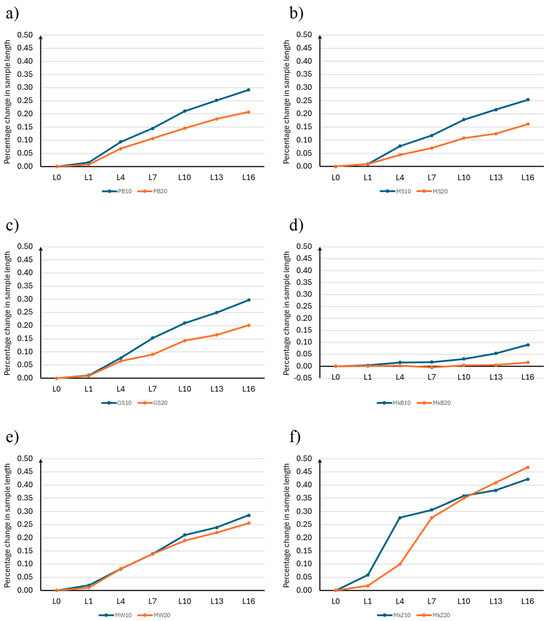 The results of the percentage change in the length of the samples for Stage 1 are presented in Table 7, and the average values are presented in Figure 4.