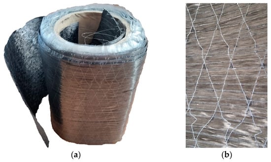 The sheets were delivered in a roll measuring 30 cm in width. The width of the applied sheet was equal to the width of the beam: 8 cm. The total length of the reinforcement was 140 cm. This value is equivalent to the length of the unsupported portion of the beam. The composite material was cut to size with scissors. Figure 1 illustrates a view of the sheet and a close-up of the fibres. The external surface of the sheet is covered with a protective layer of foil. The foil was removed directly before the application of adhesive. The load-bearing fibres are arranged in the main direction of the fabric, while the stabilising fibres are positioned in the transverse direction, forming a diagonal pattern. The thickness of the reinforcement was found to be 0.189 mm and 0.378 mm for one and two layers of reinforcement, respectively.